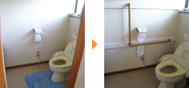 片まひで和式便座では排便動作や立ち上がり動作が困難となった為、洋式便座に取替え安定した姿勢で用が足せる様になりました。また、手すりを取り付けることで立ち上がり動作も安全 に行えるようになりました。