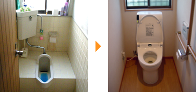 和式便器を洋式便器に取り替える工事など。ただし、既に洋式便器である場合に暖房便座、洗浄機能などを付加する工事は含まない。